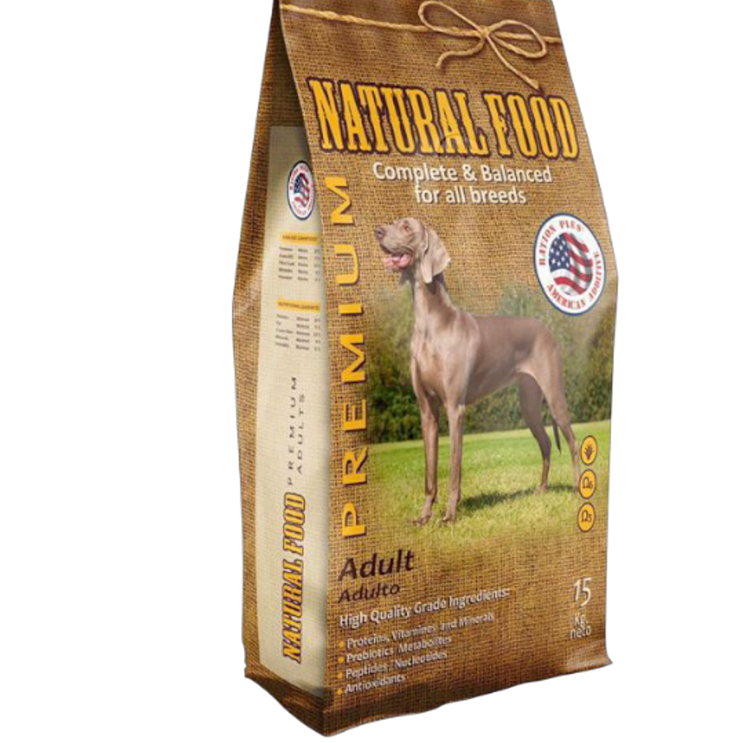 Natural Food adulto es un alimento premium indicado para perros adultos de todas las razas, formulado para generar una alta digestibilidad y palatabilidad. Contiene Ration Plus® que es un suplemento natural desarrollado en Estados Unidos, derivado de la combinación de vitaminas y minerales bio disponibles, agentes antioxidantes y metabolitos (como péptidos y nucleótidos) provenientes de la fermentación de algas marinas.